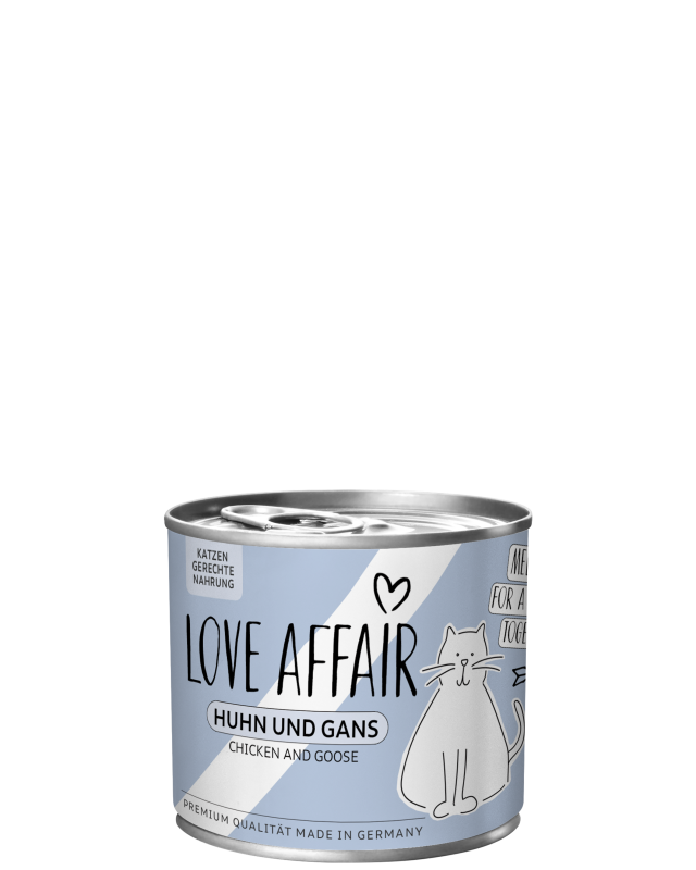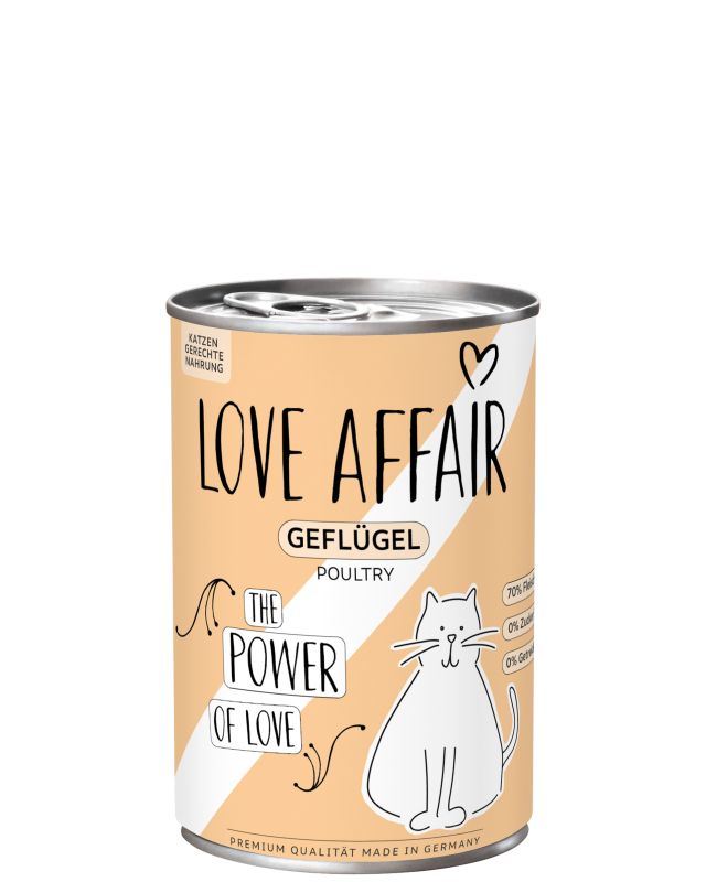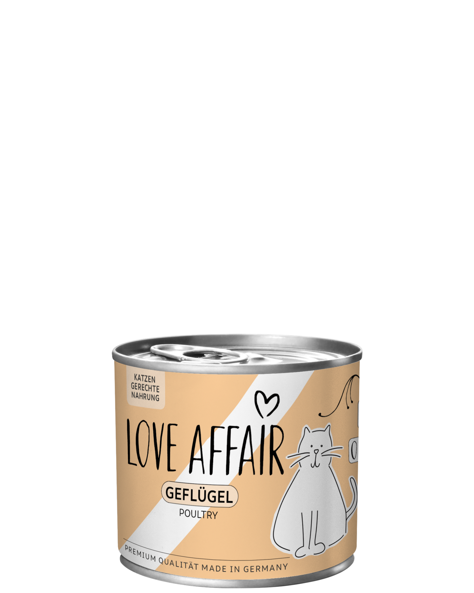 Katzen lieben Nassfutter, sie lieben die Konsistenz und den Geruch, egal in welchem Alter: Kitten, Katzen im mittleren Alter oder der gemütliche Senior schlemmen mit großem Vergnügen unsere Love Affair Menüs, die sich durch einen besonders hohen Fleischanteil auszeichnen. Die Qualität der Produkte, die selbstverständlich ohne Getreide, Zuckerzusatz oder andere künstliche Zusätze auskommt, überzeugt nicht nur die Samtpfoten, sondern auch den Menschen. Wir achten auf höchste Qualität der Rohwaren, auf deren schonende Verarbeitung und die richtige Zusammensetzung der Menüs, um Katzen rundum mit allen wichtigen Nährstoffen zu versorgen. Love Affair Nassnahrung wird in Deutschland hergestellt.